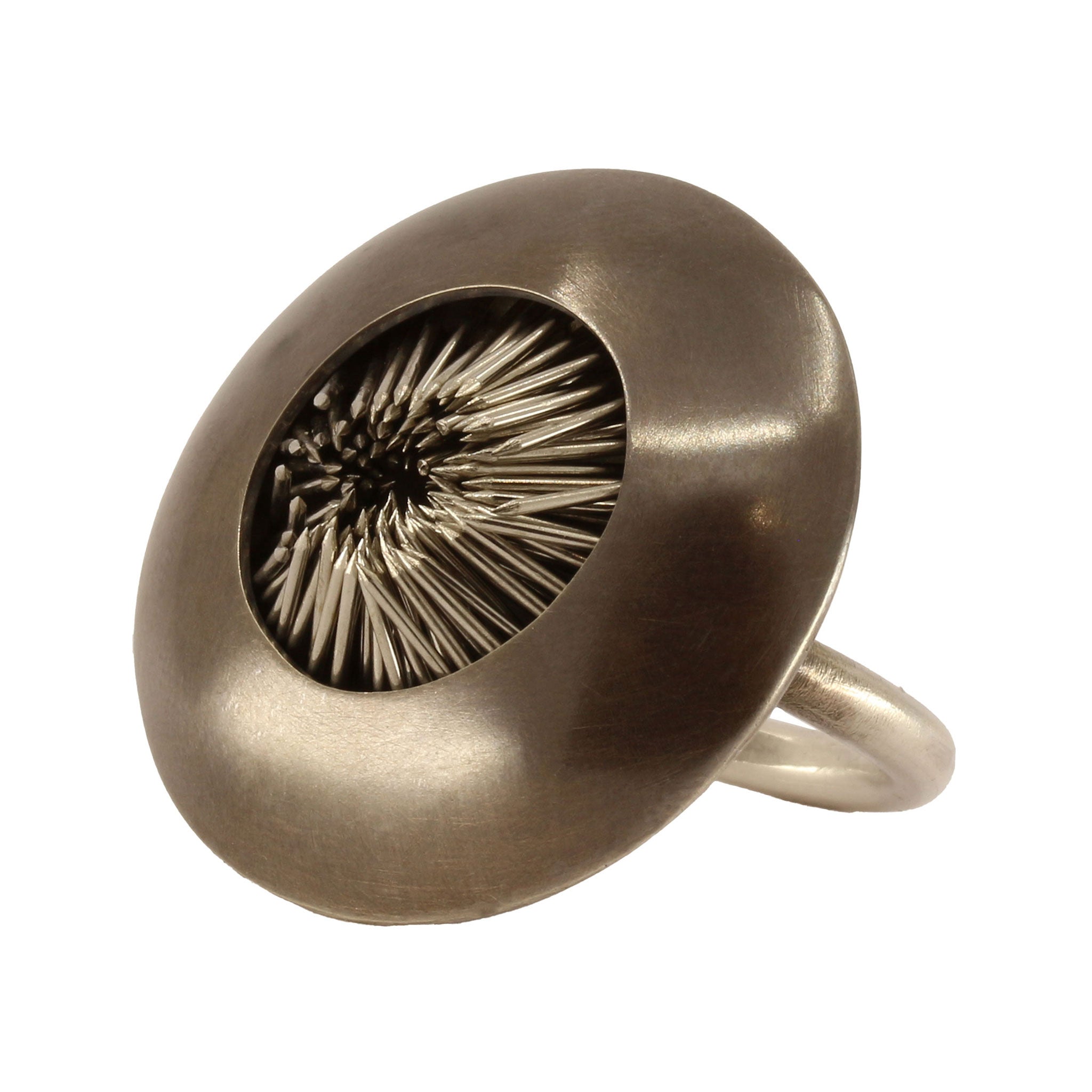 Characterised by a minimalist look, Alice Biolo’s Hide Collection explores the theme of the hidden, encapsulating intricate designs inside smooth sterling silver structures, visible only through a circular opening. At first glance, they may appear fundamental in shape, but as a glimmer of light catches them, the elements enclosed within these structures, such as sharp pins and gemstones, reveal themselves in motion. Combining traditional techniques with modern technology, such as the use of a laser welder, these pieces of jewellery come to life, from statement rings to more subtle pins for everyday wear.