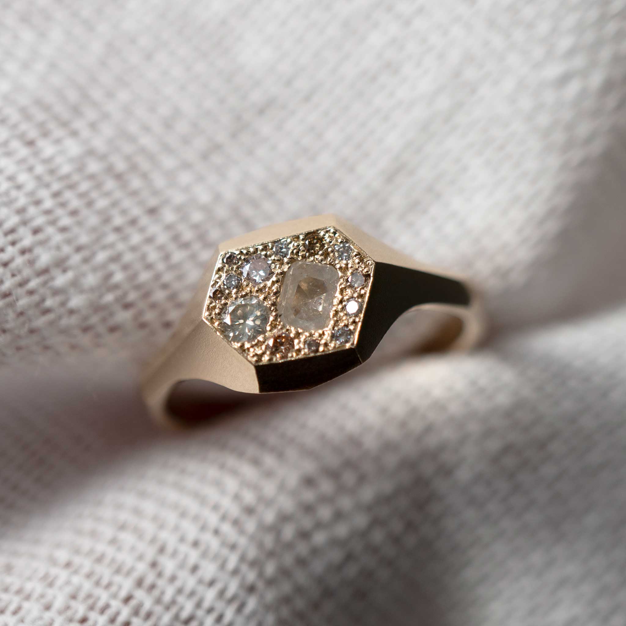 Atacama: A Collection of Desertic Geological Finds takes its name from a Chilean desert - the driest in the world. María Manola Toro draws inspiration from this vast, dry, soil landscape; the architecture of volcanoes and the Andes peaks, the cracked salty textures in the salares (salt flats), and the warm colour tones found in the soil and minerals. The collection features rings, pendants, and earrings crafted in 9ct and 18ct yellow gold, which showcase earthy-neutral tones in champagne, salt and pepper, yellow, and white diamonds. Small pops of green evoke the minimal local flora. Pavé settings and milgrain details add depth and a rich texture throughout the collection, much like the dry soil or the salt flats in the Atacama Desert. Each piece in the collection is imagined as a small find from this unique place.