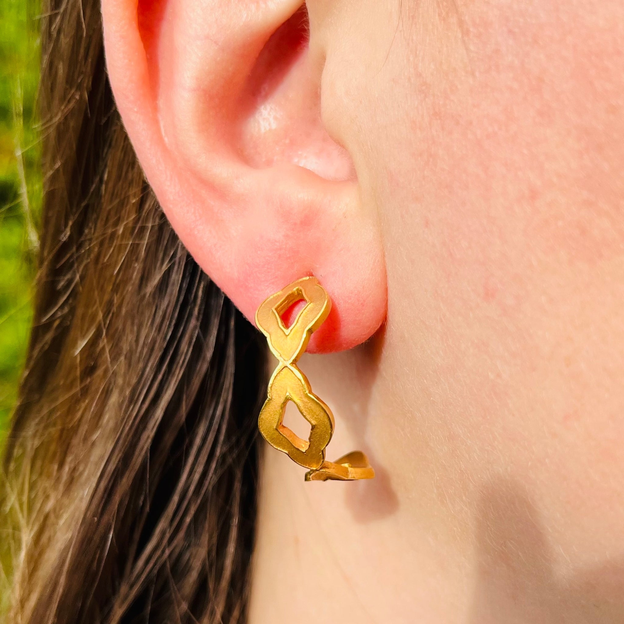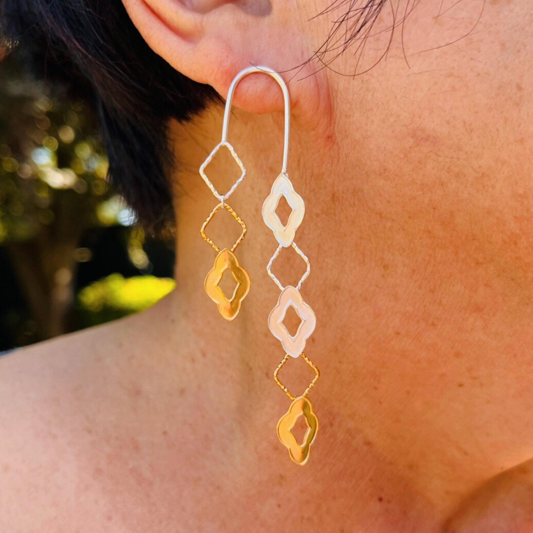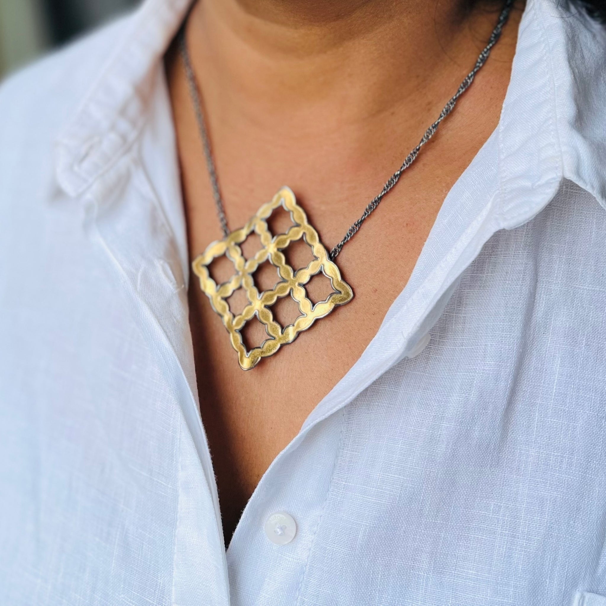 The Light & Shadows Collection brings together window panel designs from Sri Lanka, and architectural aesthetics and sculptural forms from buildings and bridges. Shadows cast from the decorative cut-out patterns on wooden window panels, metal grills and gates, form the inspiration behind the collection. She brings her jewellery designs to life using repetitive patterns and references to the interplay of light and shadow. A shadow effect is created through a combination of polished and oxidised silver, and gold-plating. Each piece is made using recycled silver and ethically sourced gemstones. Bringing together the beautiful window panel designs of eastern and western architecture, Shirani creates wearable art and statement jewellery, alongside items suitable for everyday wear.