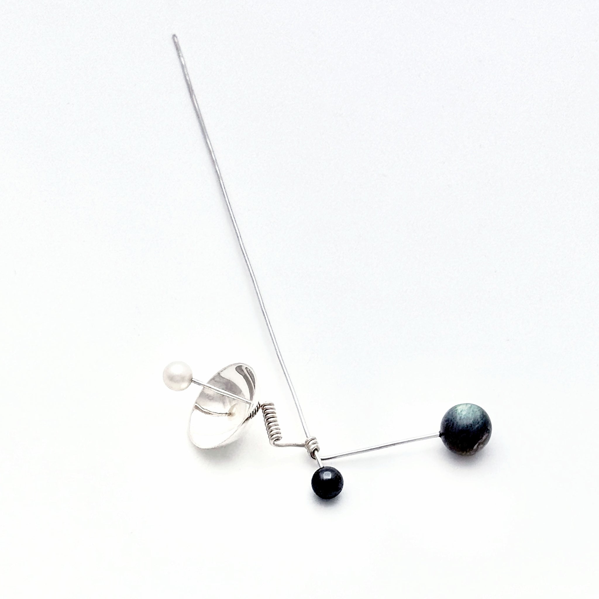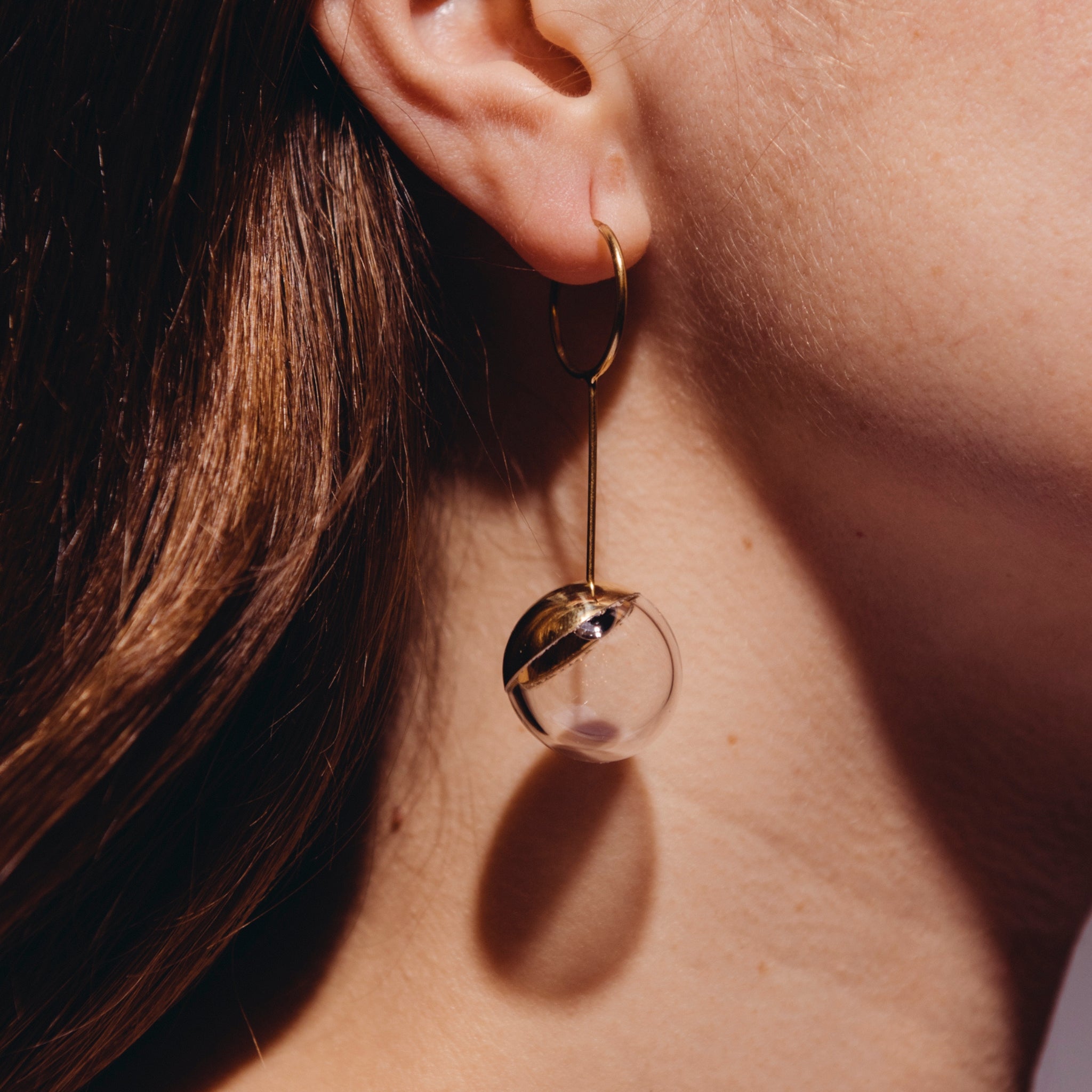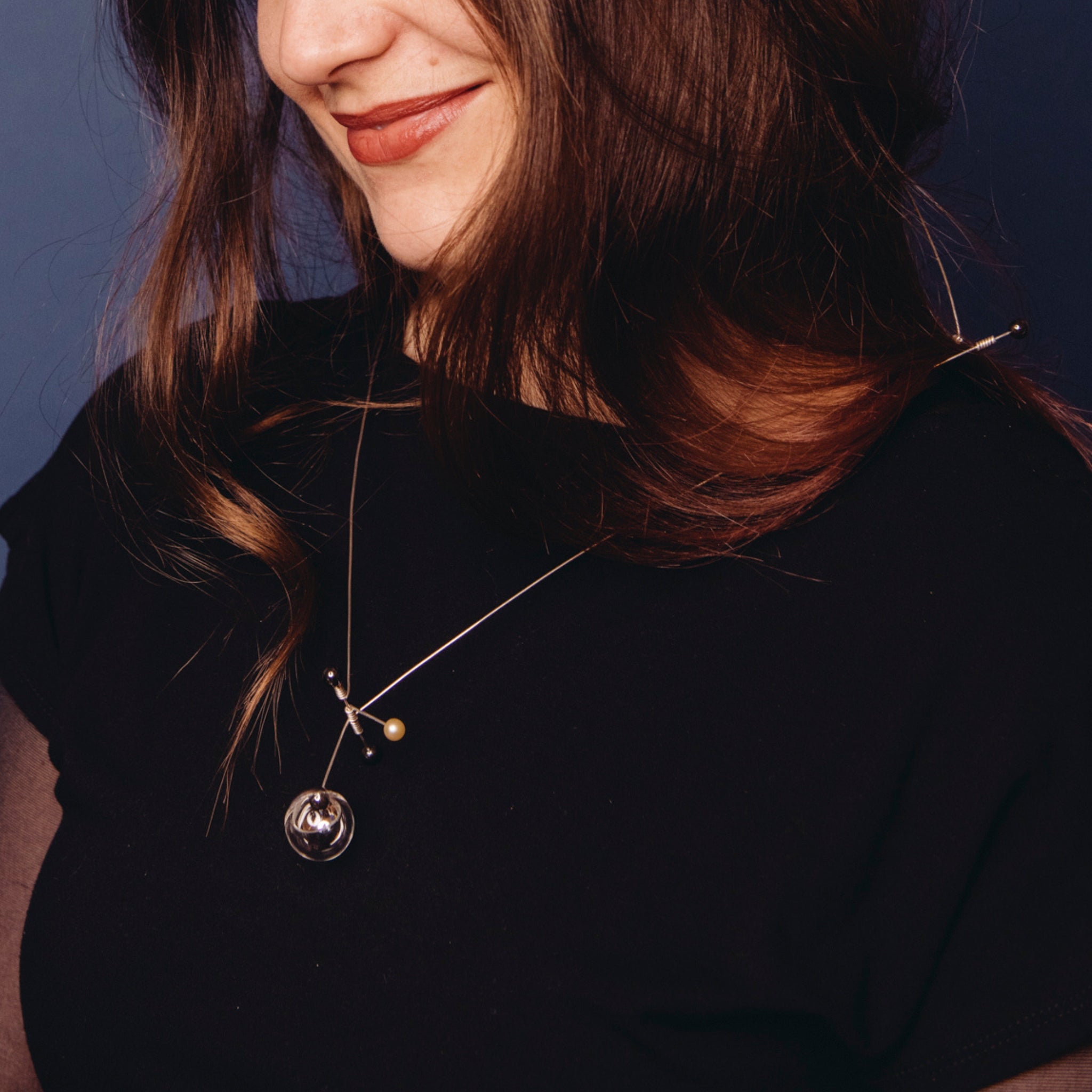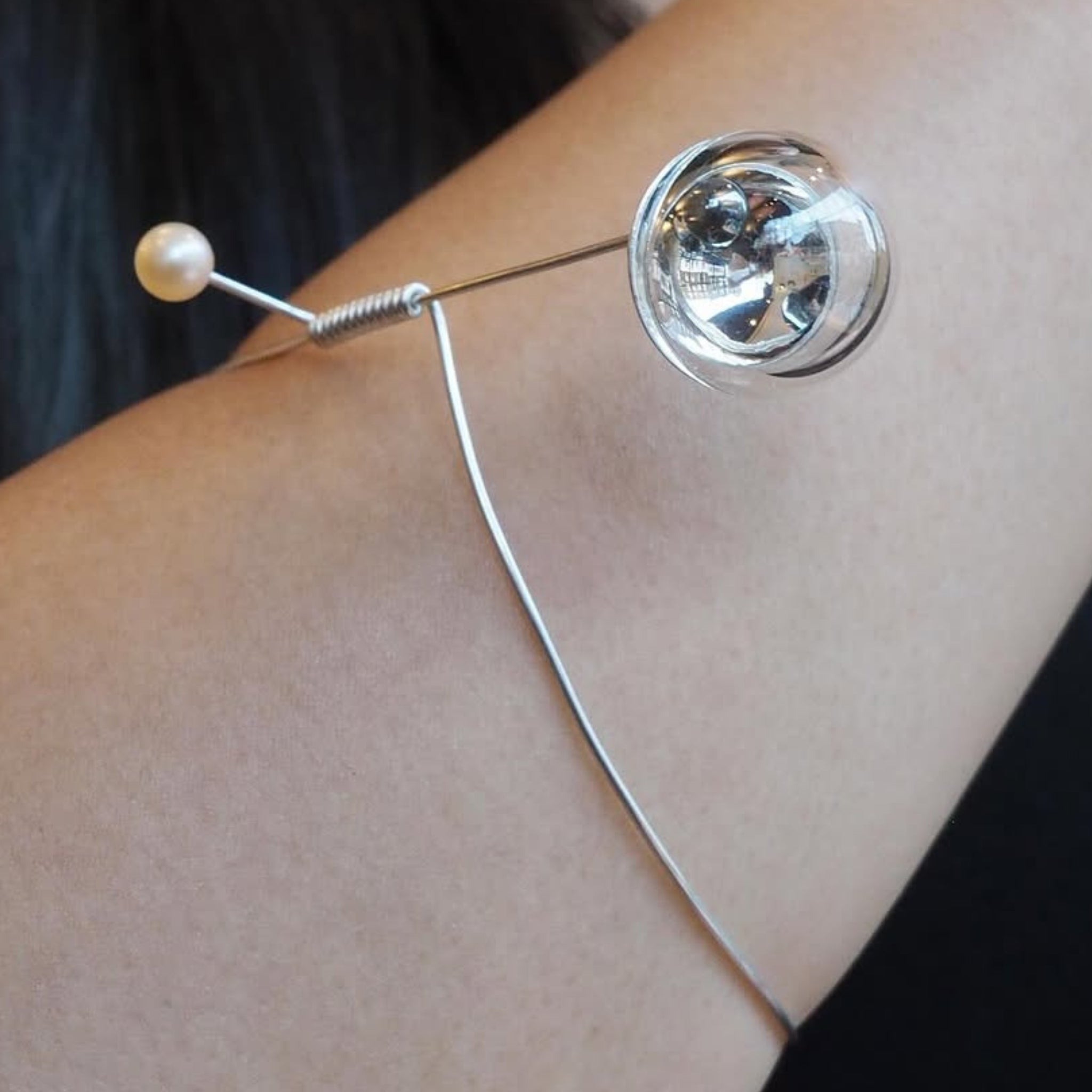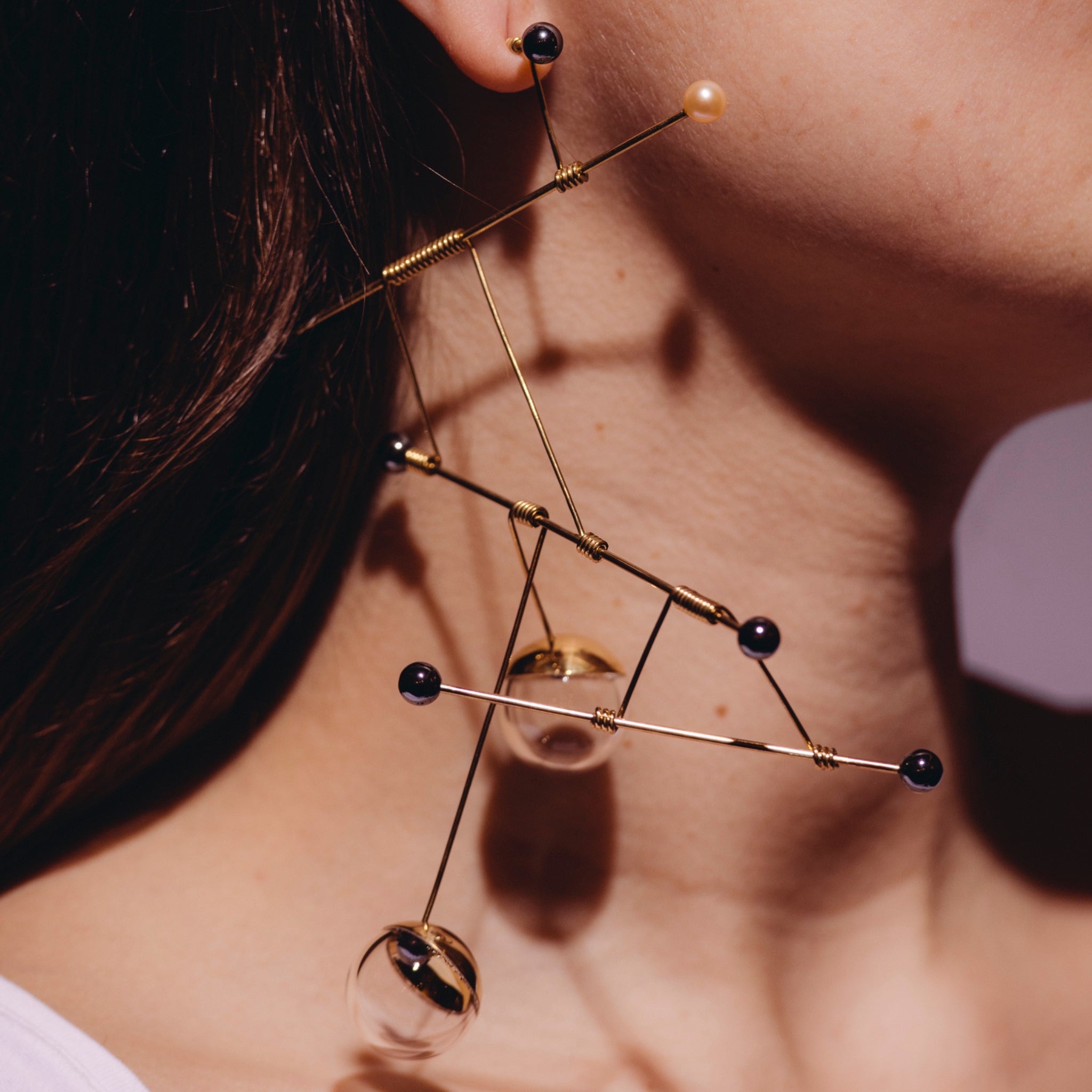 The NIBIRU Collection comprises a series of kinetic jewellery pieces, deeply influenced by sound art and kinetic art. The work explores themes of connection, distance, and movement: ‘Sound is a medium overcoming distance. By overcoming distance, we overcome difference.’ Each piece is named after a real star, symbolising an interconnected universe. Some pieces emit a gentle chime when worn, responding to the wearer’s movement and proximity. Through this interaction, Wenyin reimagines jewellery as a multisensory experience, bridging the physical and the emotional. Each piece is carefully handcrafted in her London studio, with precious metals and borosilicate glass forming the core of her work.